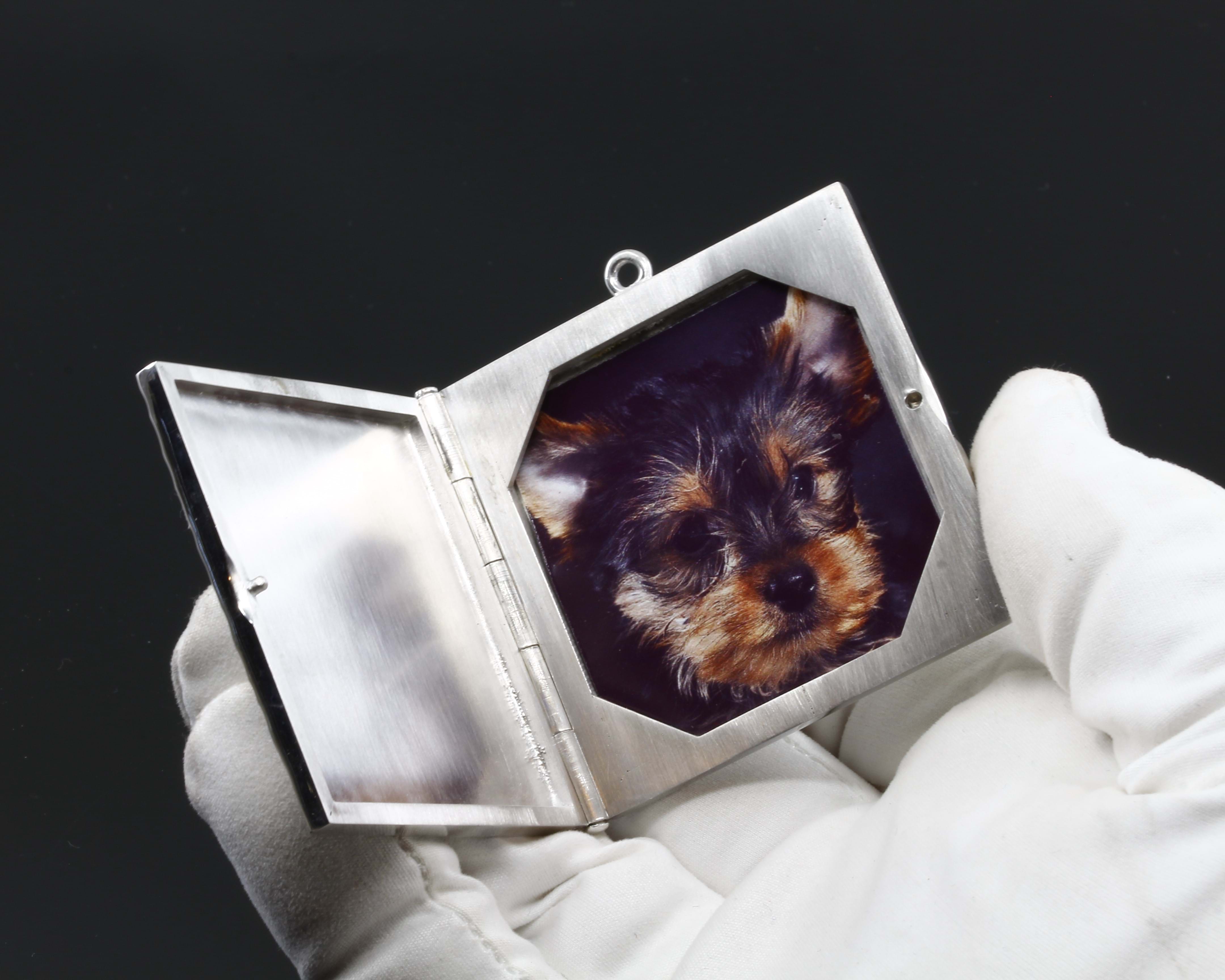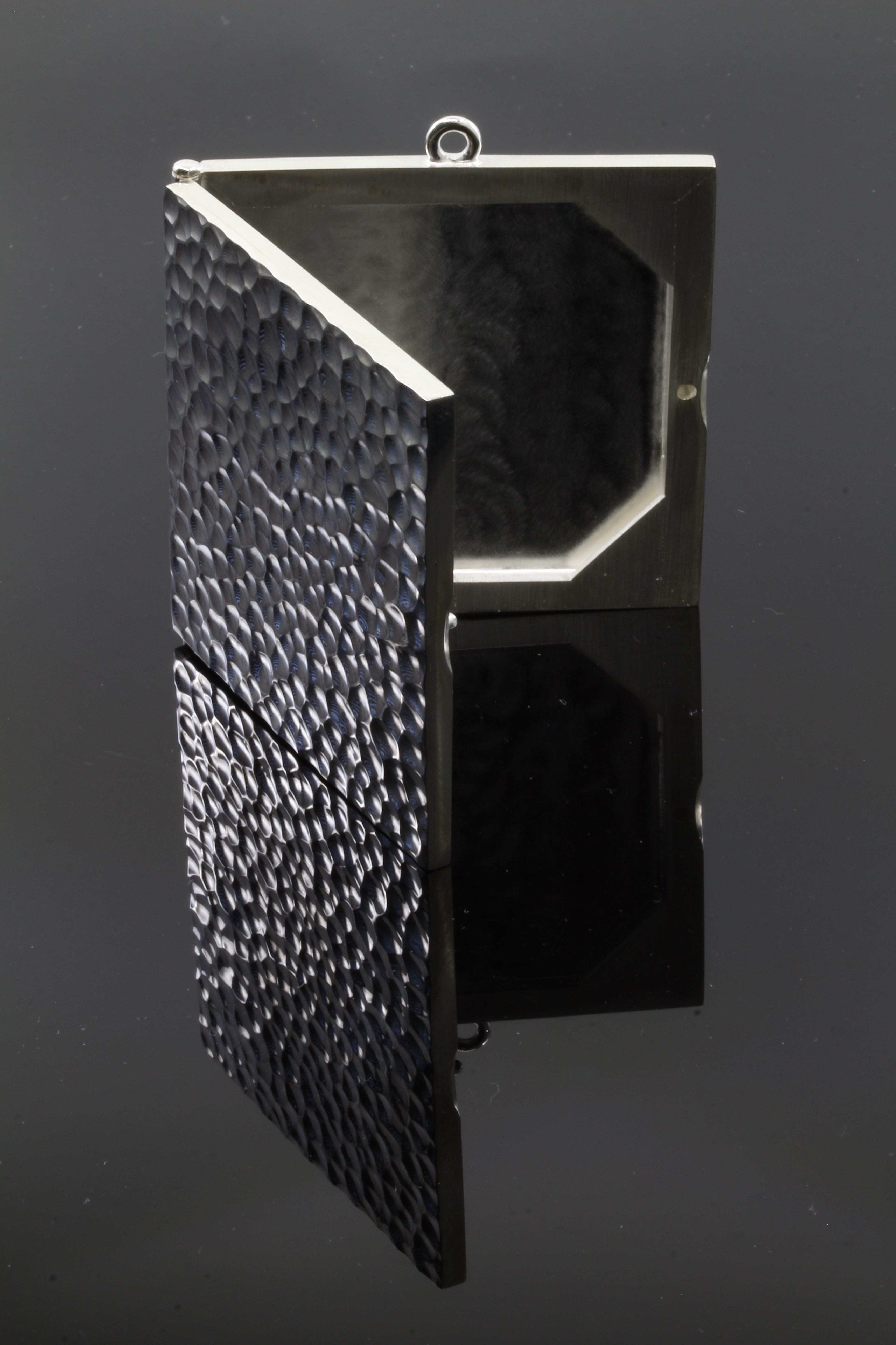 handmade 'fishscale' texture oxidised silver locket requested by Tamara. The square picture frame has 4 triangular corners referencing the old paper 'corners' used to keep images in place in early photograph albums.