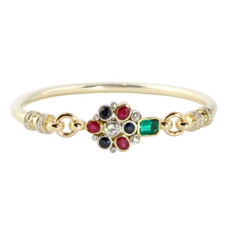 9ct yellow gold bangle with diamonds, sapphires and tourmaline