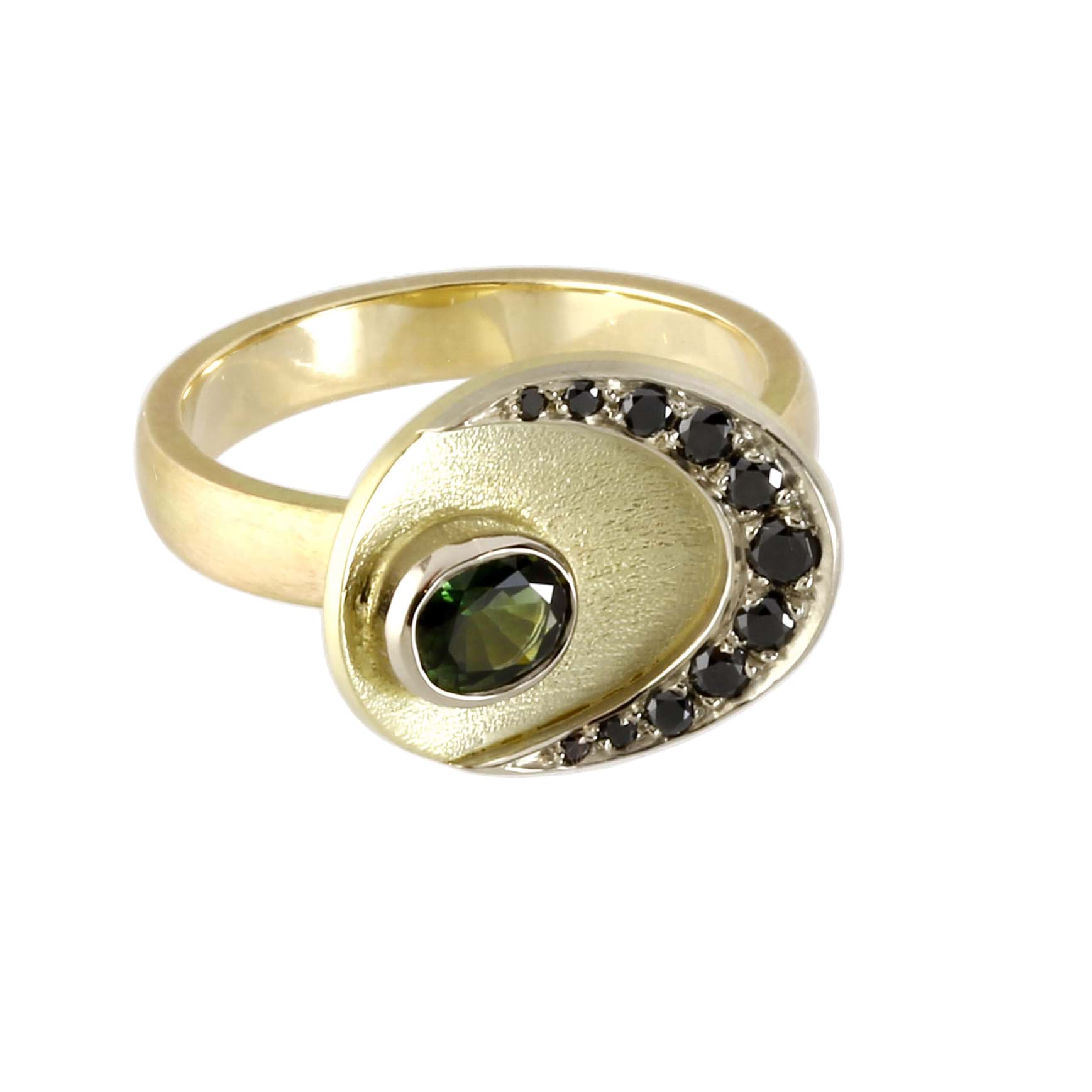14ct yellow gold peacock ring with green sapphire and black diamonds