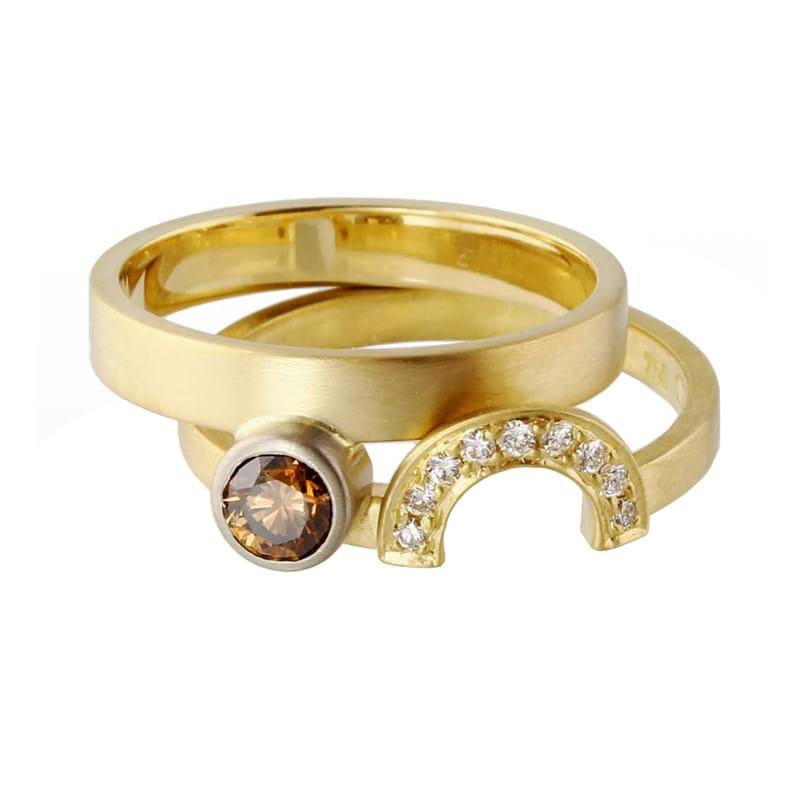 yellow gold fitted engagement & wedding ring with cognac & white diamonds