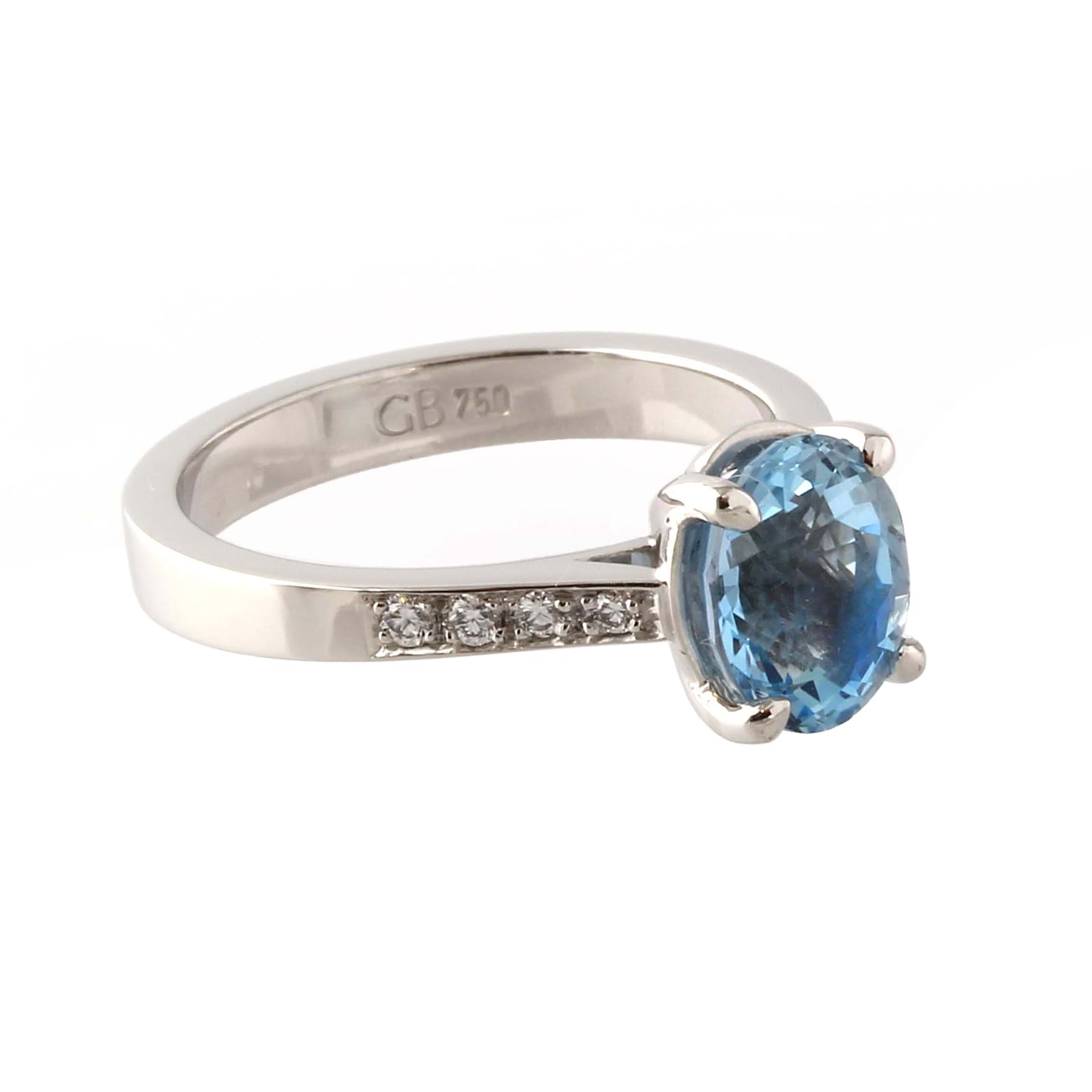 white gold aquamarine engagement ring with grain-set diamond shoulders