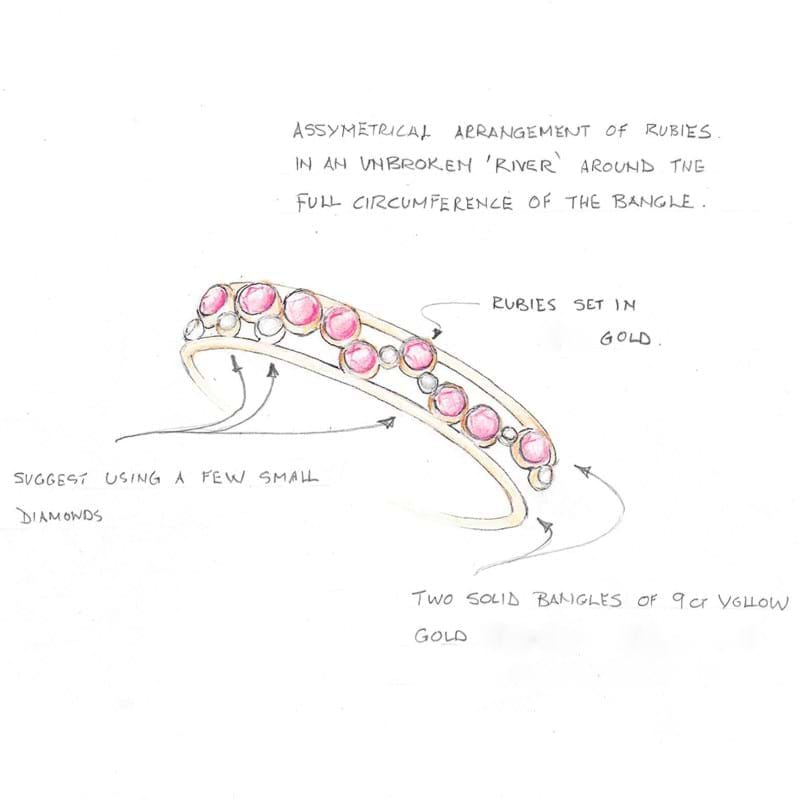 random arrangement of rubies and yellow sapphires set between two solid bangles of 9ct yellow gold